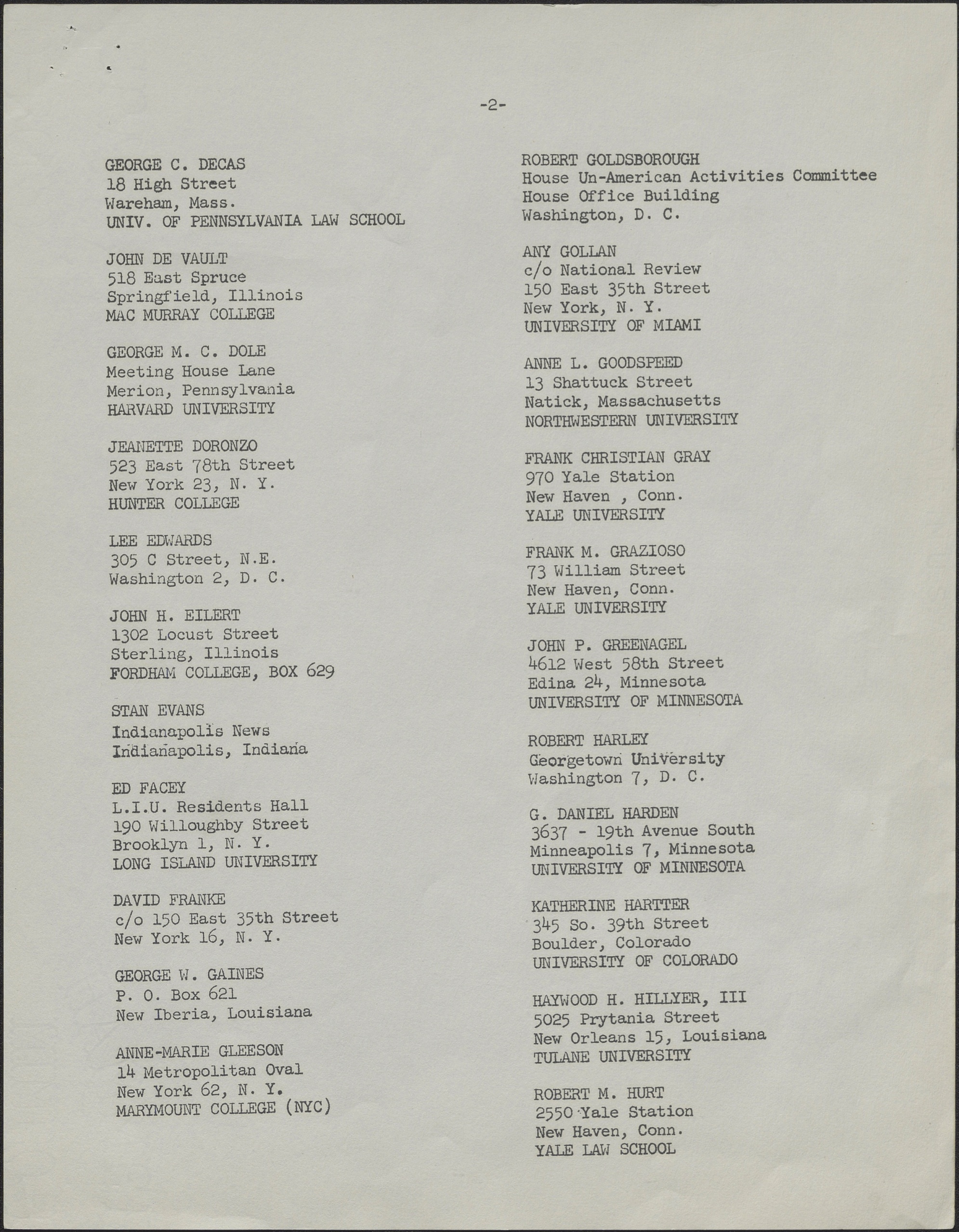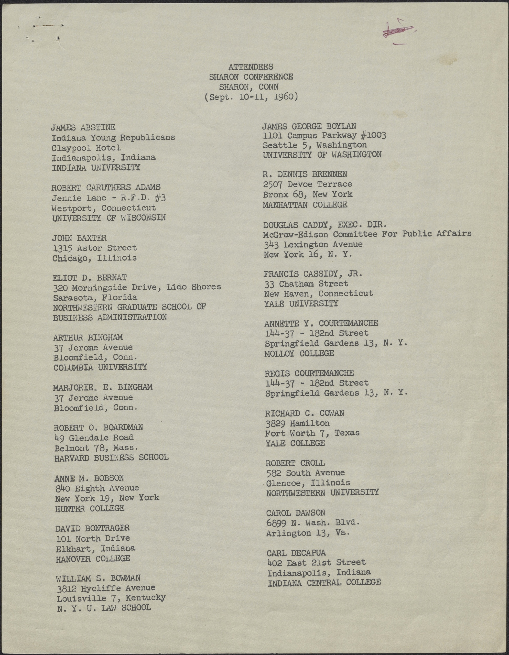 In September 1960, a diverse group of college students and young professionals convened in Sharon, Connecticut, to lay the groundwork for a new conservative organization that would soon make waves in national politics: Young Americans for Freedom (YAF). The typed list shown here reflects the breadth of attendees—men and women from universities and colleges across the United States, gathered under one roof to share ideas, articulate principles, and craft a strategic vision for conservative youth activism.