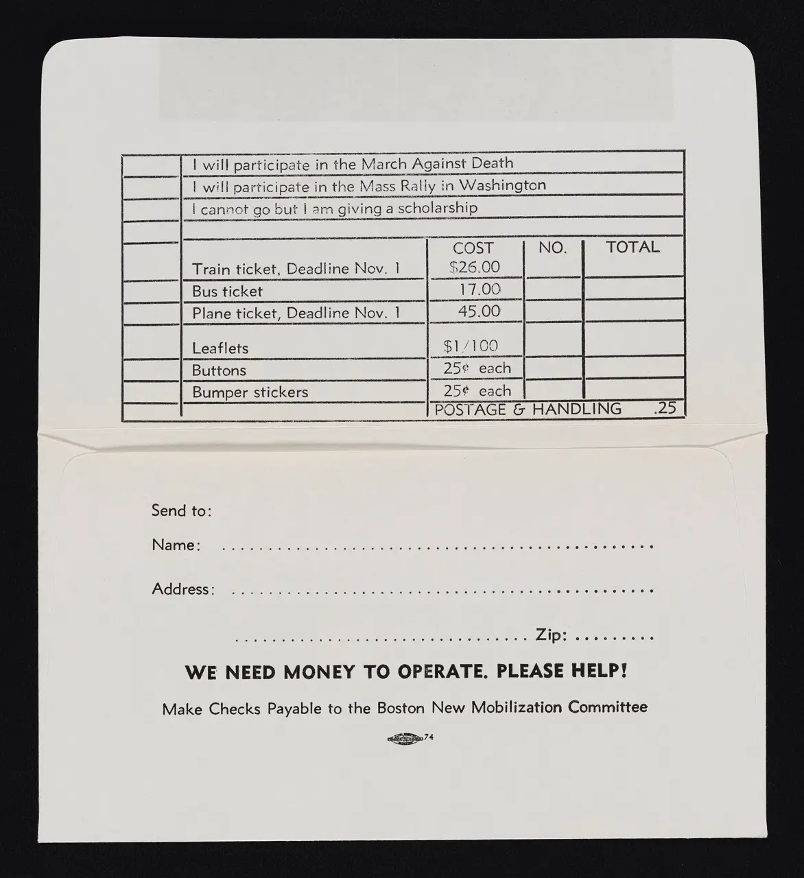 In the fall of 1969, anti-war sentiment in the United States reached a peak. Following the massive Moratorium to End the War in Vietnam in October, activists sought even broader demonstrations. The March Against Death specifically aimed to draw attention to the mounting casualties—both American servicemen and Vietnamese civilians—and culminated in a solemn procession and larger rally in Washington. The Boston New Mobilization Committee’s envelope exemplifies how local chapters of national organizations facilitated travel, collected donations, and provided updates to protestors determined to make their voices heard in the capital.
