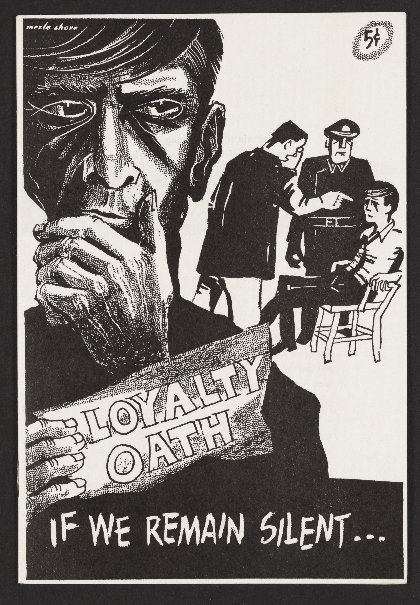 Merle Shore’s cover art depicts an anxious figure grasping a torn “Loyalty Oath,” while, in the background, men in dark uniforms interrogate another citizen. It underscores the pamphlet’s central message: silence in the face of authoritarian intrusion endangers everyone’s freedom. - Dramatic Headlines and Excerpts