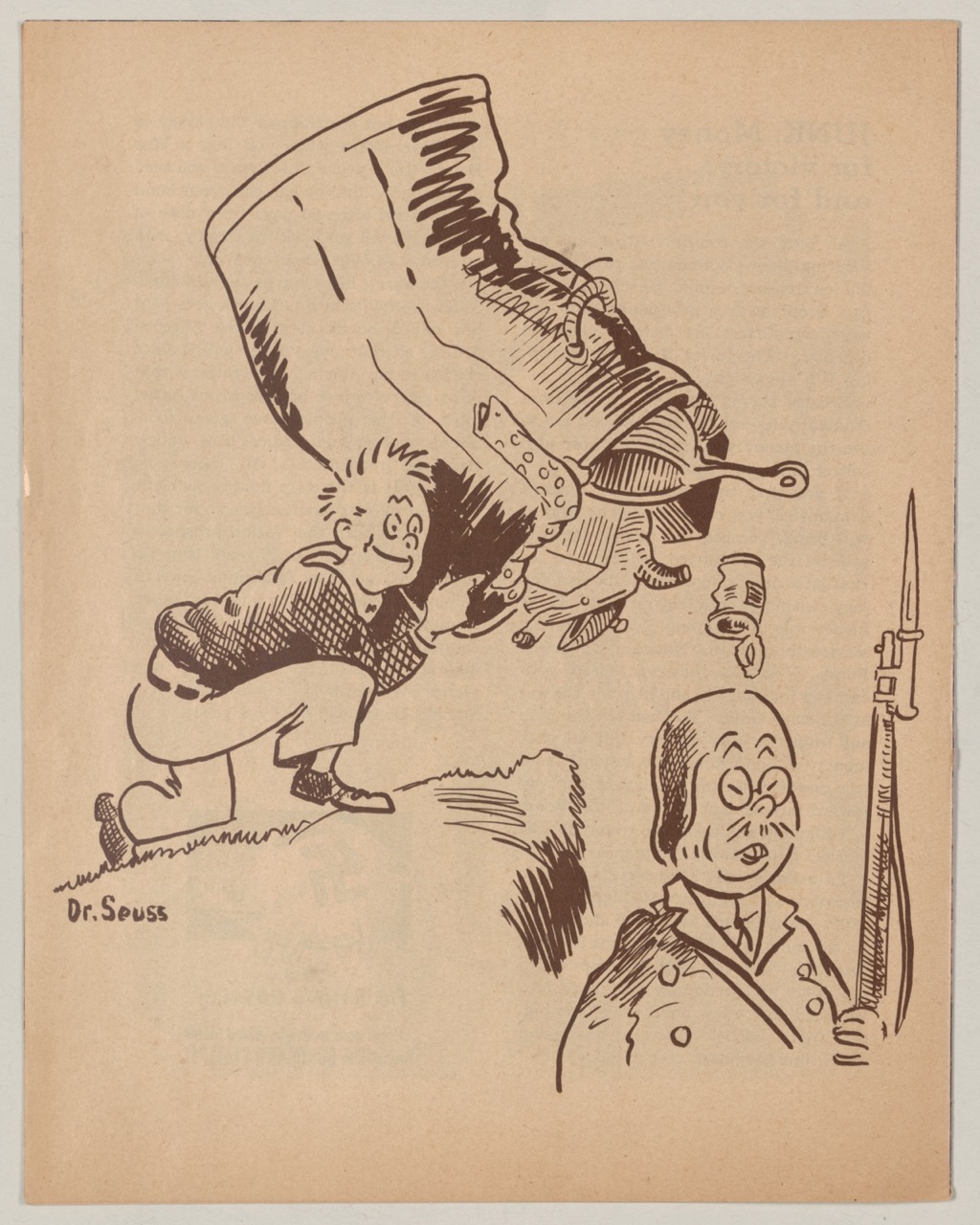 Emphasizing that “junk and money go to war,” the pamphlet ties simple domestic chores (searching the attic, sorting metals) to front-line needs. This direct link between the home front and battle lines makes the call to action feel personal and urgent. - Dr. Seuss Illustrations