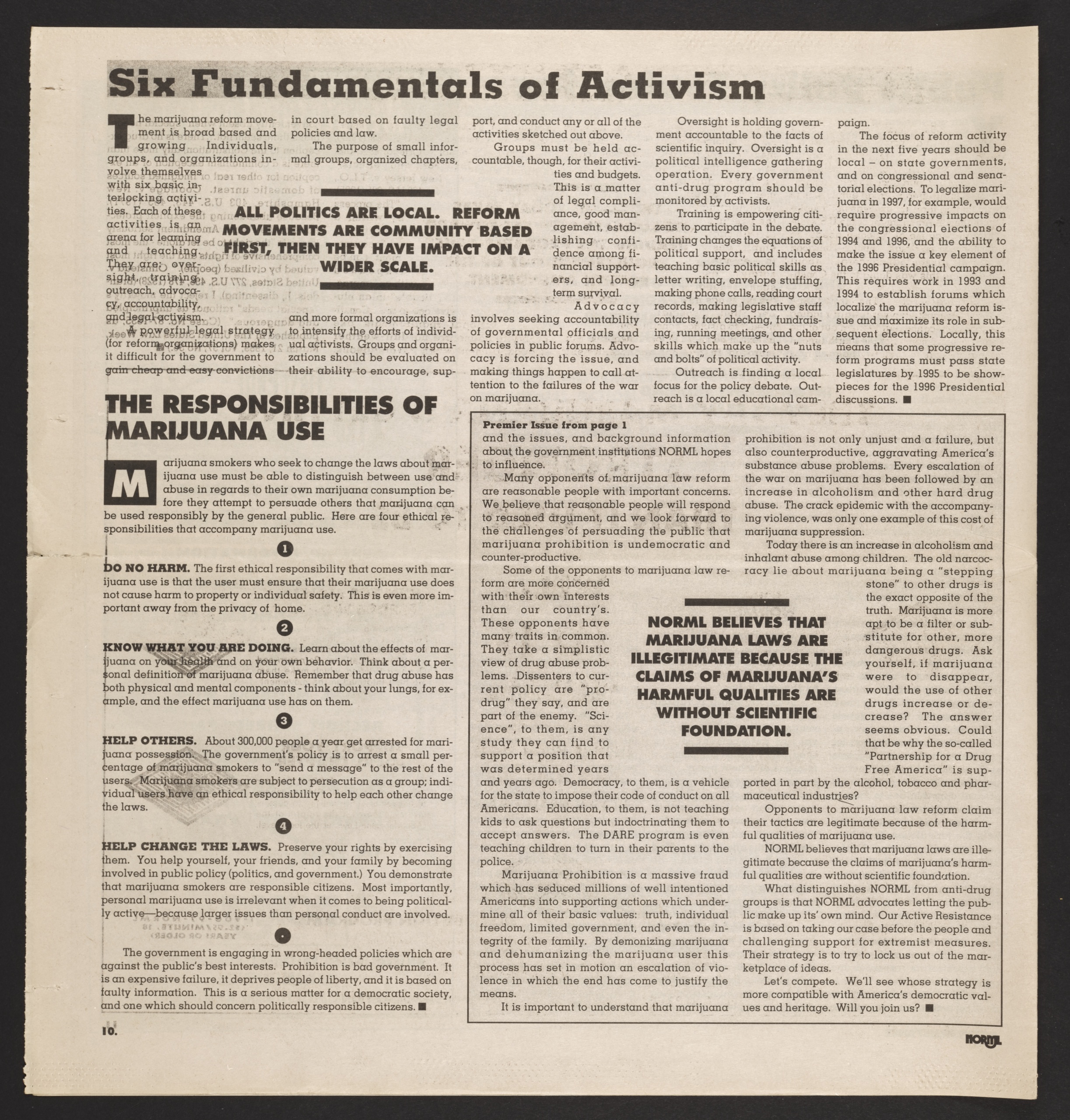 - Calls to Action: Nearly every page urges readers to contact local and national elected officials, share credible information, or become more involved in reform campaigns. NORML also highlights membership benefits, further knitting together a community of activists.