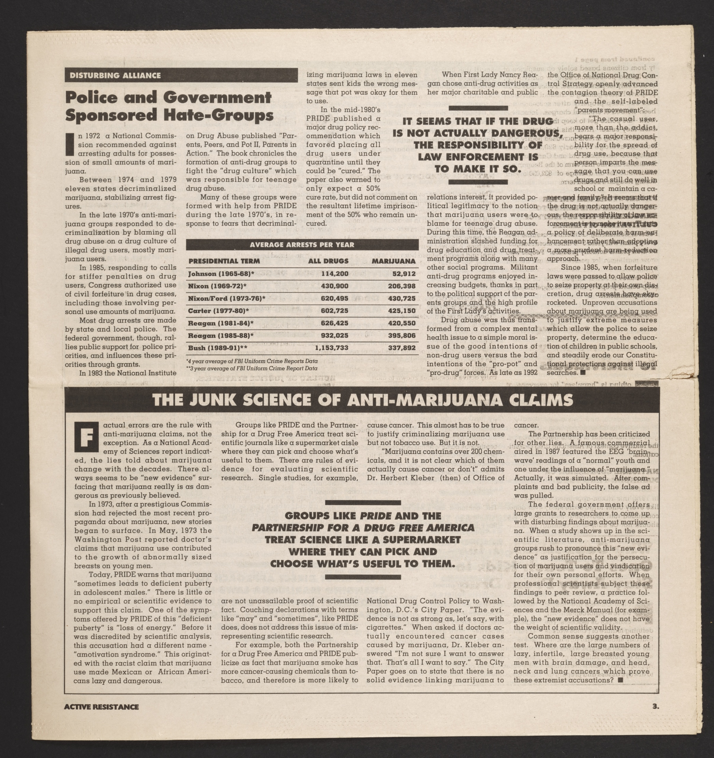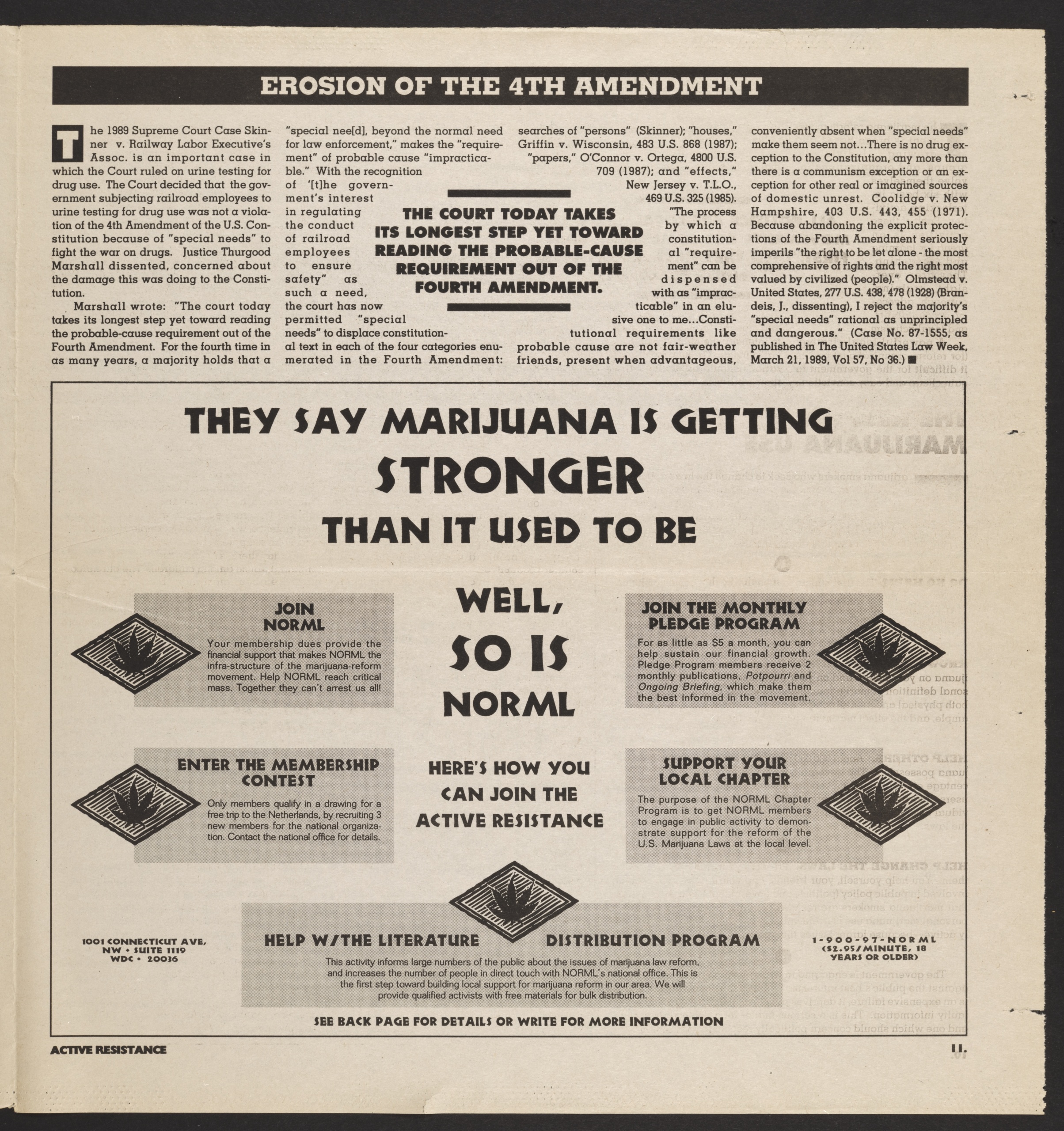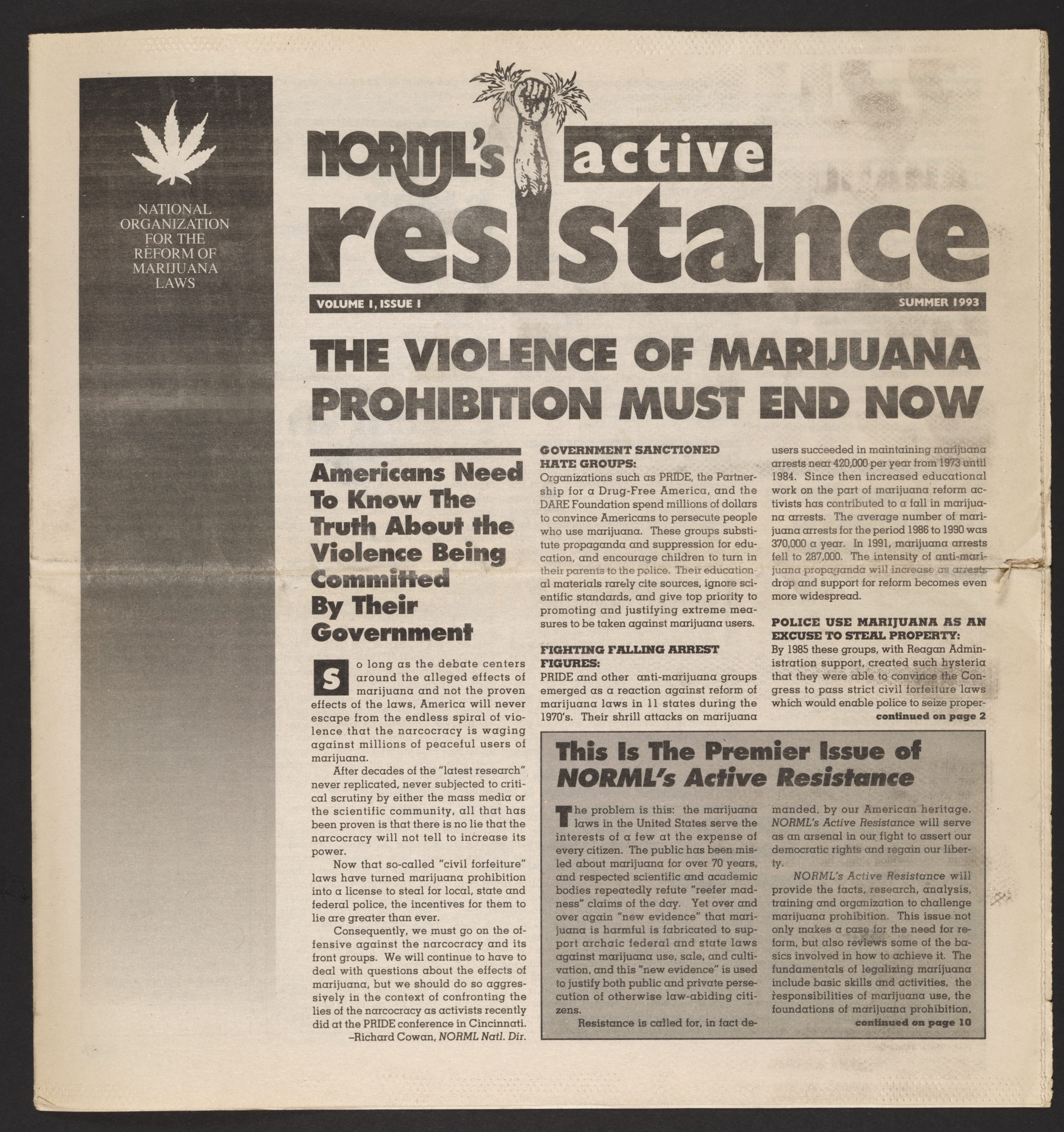 The early 1990s marked a pivotal period in America’s drug policy debate. Despite a handful of states relaxing penalties for minor marijuana possession in the 1970s, the Reagan and Bush administrations doubled down on strict enforcement. By 1993, arrests for nonviolent drug offenses had soared, and civil asset forfeiture laws increasingly meant that suspects—often convicted of no crime—could see their property seized. NORML responded by publishing comprehensive newsletters like Active Resistance, building on decades of advocacy since its 1970 founding and tapping into growing skepticism of the War on Drugs.