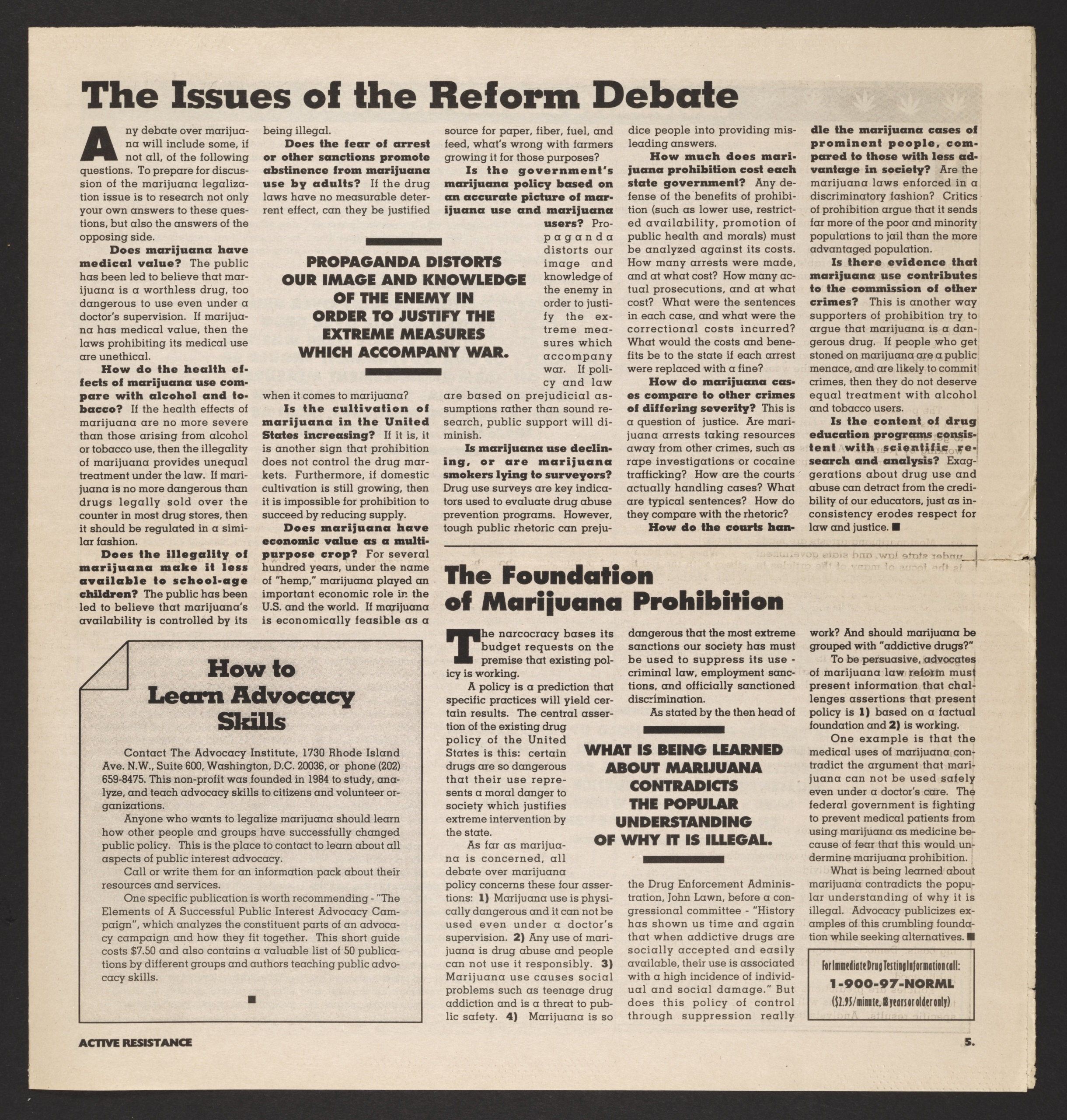 The National Organization for the Reform of Marijuana Laws (NORML) launched this inaugural issue of Active Resistance in the summer of 1993 to mobilize grassroots support against the escalating War on Drugs. Declaring in bold headlines that “THE VIOLENCE OF MARIJUANA PROHIBITION MUST END NOW,” the newsletter takes direct aim at the federal government’s aggressive marijuana policies. It weaves together testimonials, legal analysis, and editorial commentary to argue for decriminalization, highlight systemic injustices, and empower readers to take action.