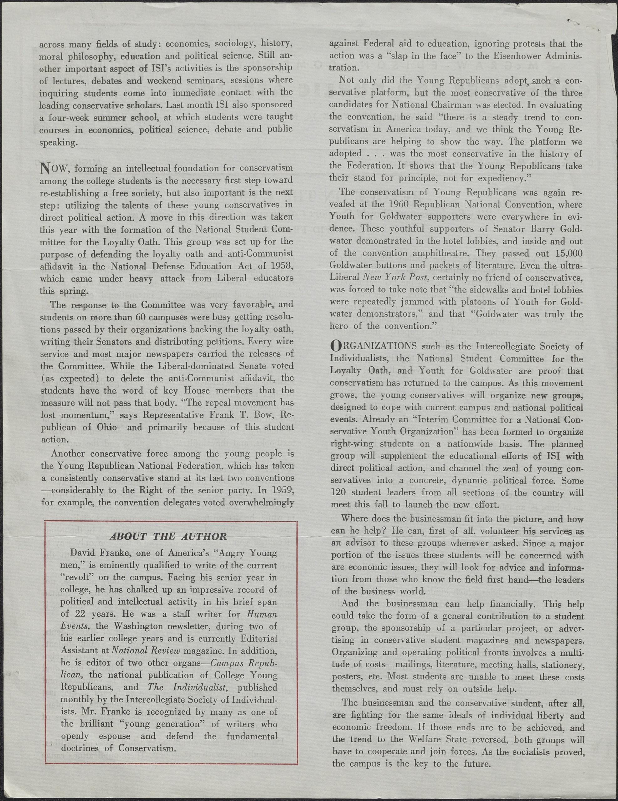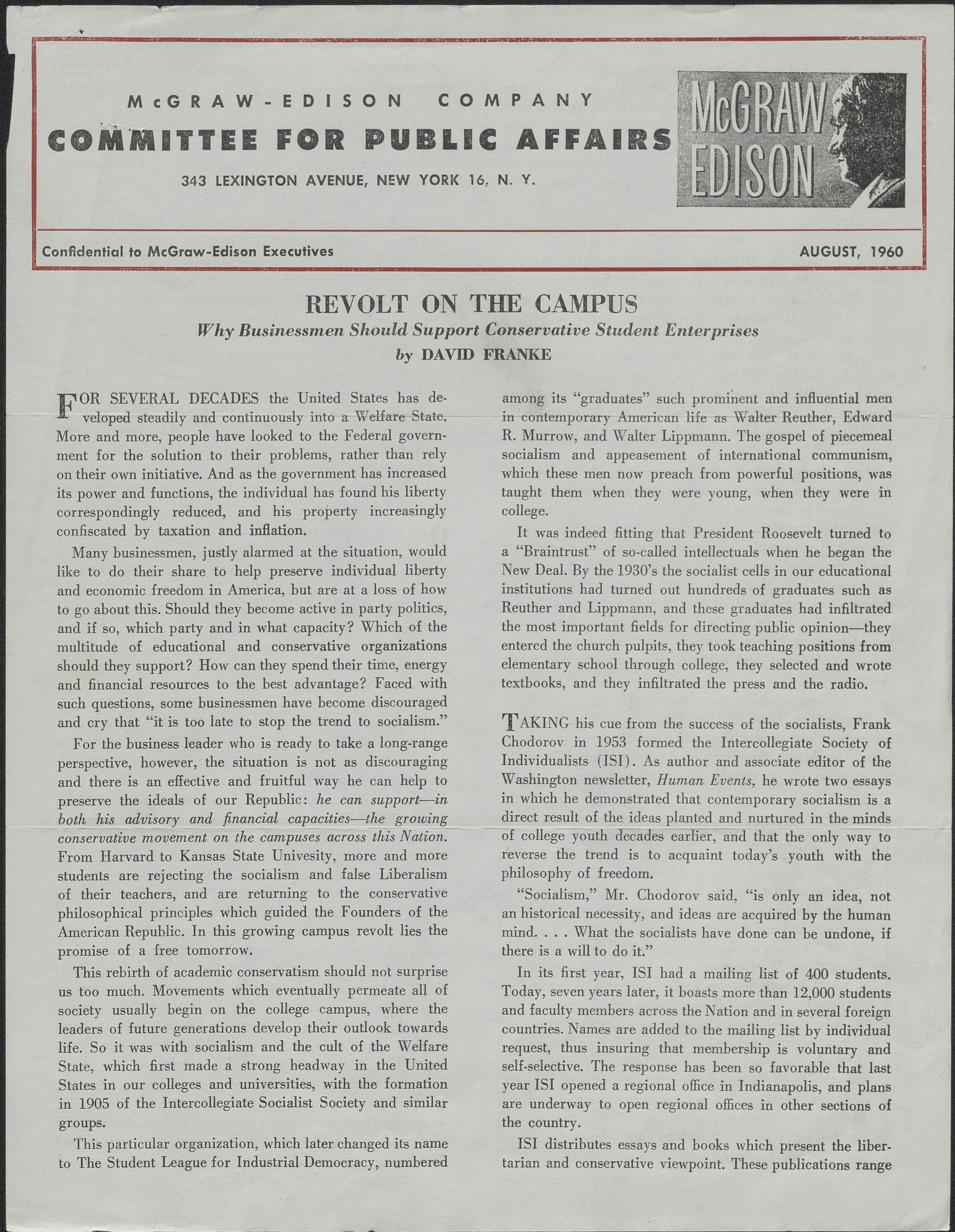 In August 1960, the McGraw-Edison Company’s Committee for Public Affairs distributed a confidential pamphlet titled “Revolt on the Campus: Why Businessmen Should Support Conservative Student Enterprises,” authored by David Franke. This document urged corporate leaders to invest in and ally themselves with a growing wave of conservative student organizations, casting college campuses as crucial ideological battlegrounds in Cold War–era America.