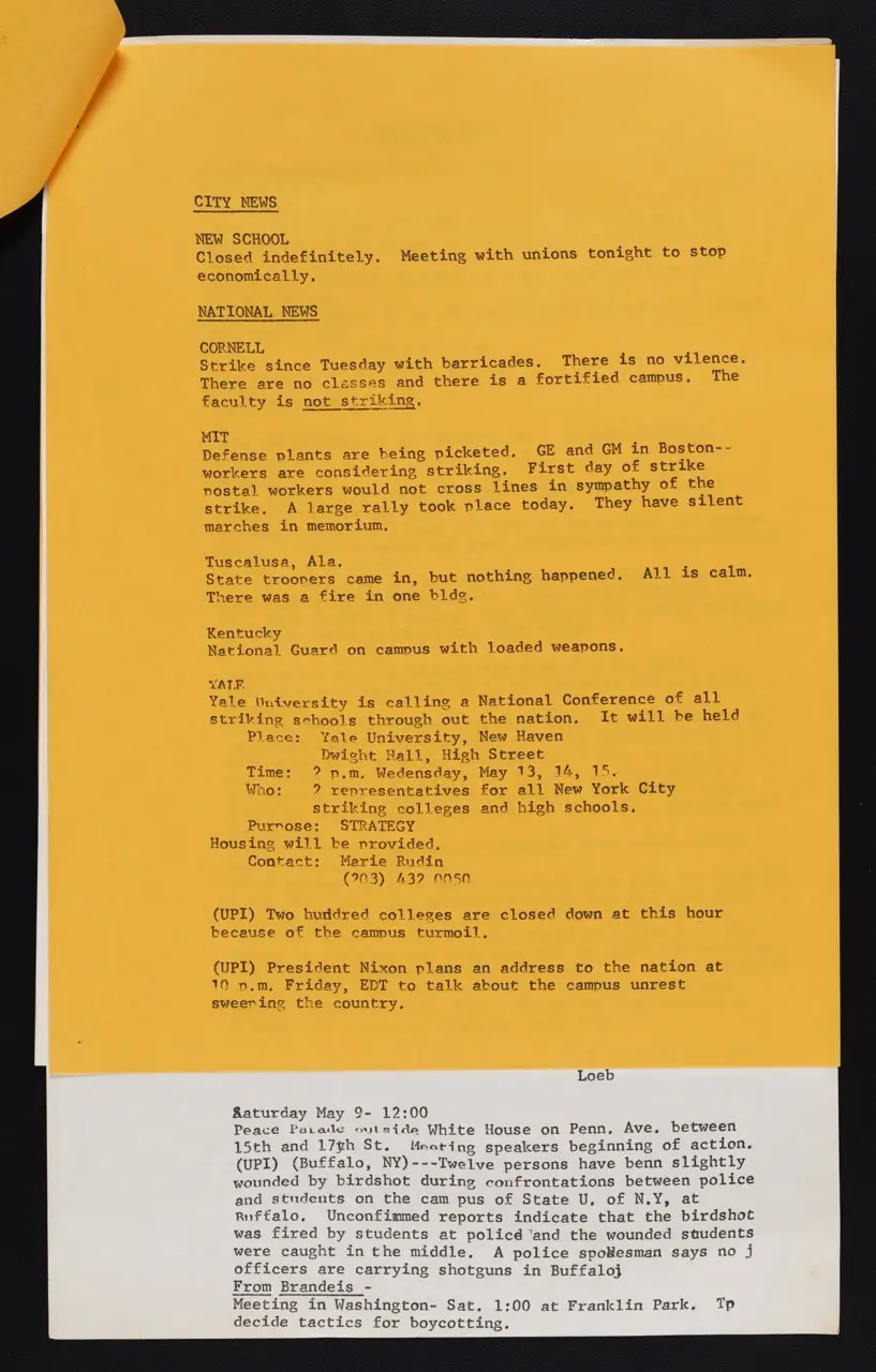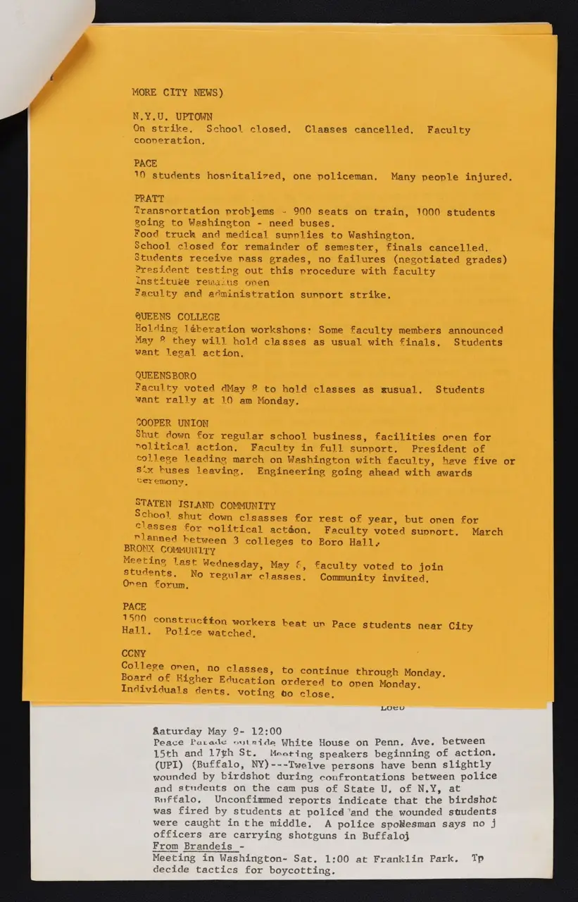 This multi-page packet—typed on both white and yellow paper—provides a remarkable glimpse of the activism unfolding across New York City and beyond in early May 1970. Building on prior “#NYU News” bulletins, these updates chronicle campus strikes, cancellations, and protest plans in response to the escalation of the Vietnam War into Cambodia and the killings at Kent State University on May 4. With calls for rallies, phone-ins, and strategic meetings, the leaflet reveals how rapidly students, faculty, and local communities banded together to protest the war and demonstrate solidarity with affected campuses nationwide.