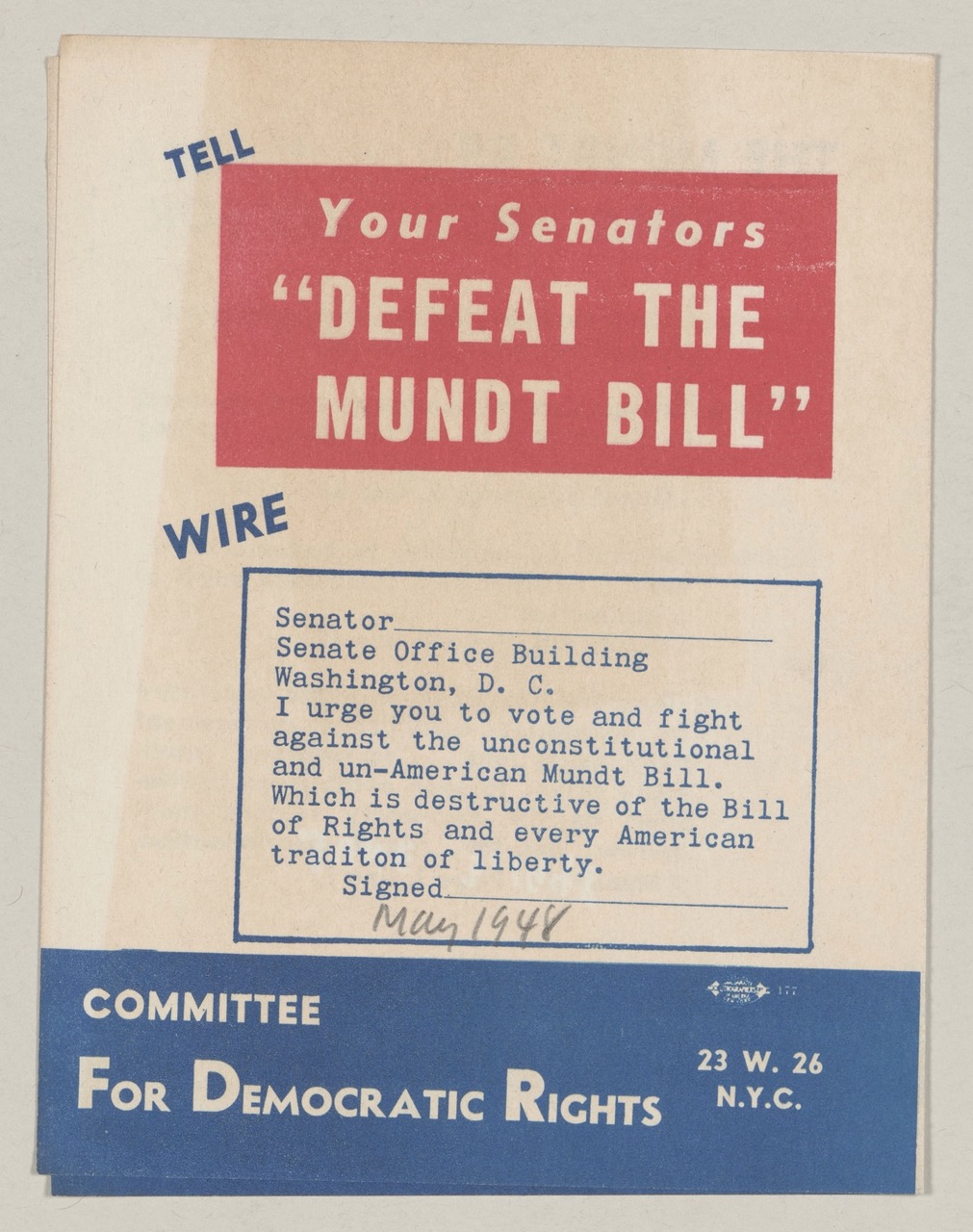 This pamphlet—titled “America’s New Look in ’48? NO!”—was produced by the Committee for Democratic Rights, rallying citizens to pressure their senators to oppose the bill. With bold cartoon imagery and stark references to Adolf Hitler’s own suppression of dissent, the pamphlet warned readers that the Mundt Bill risked turning the U.S. into an authoritarian state.