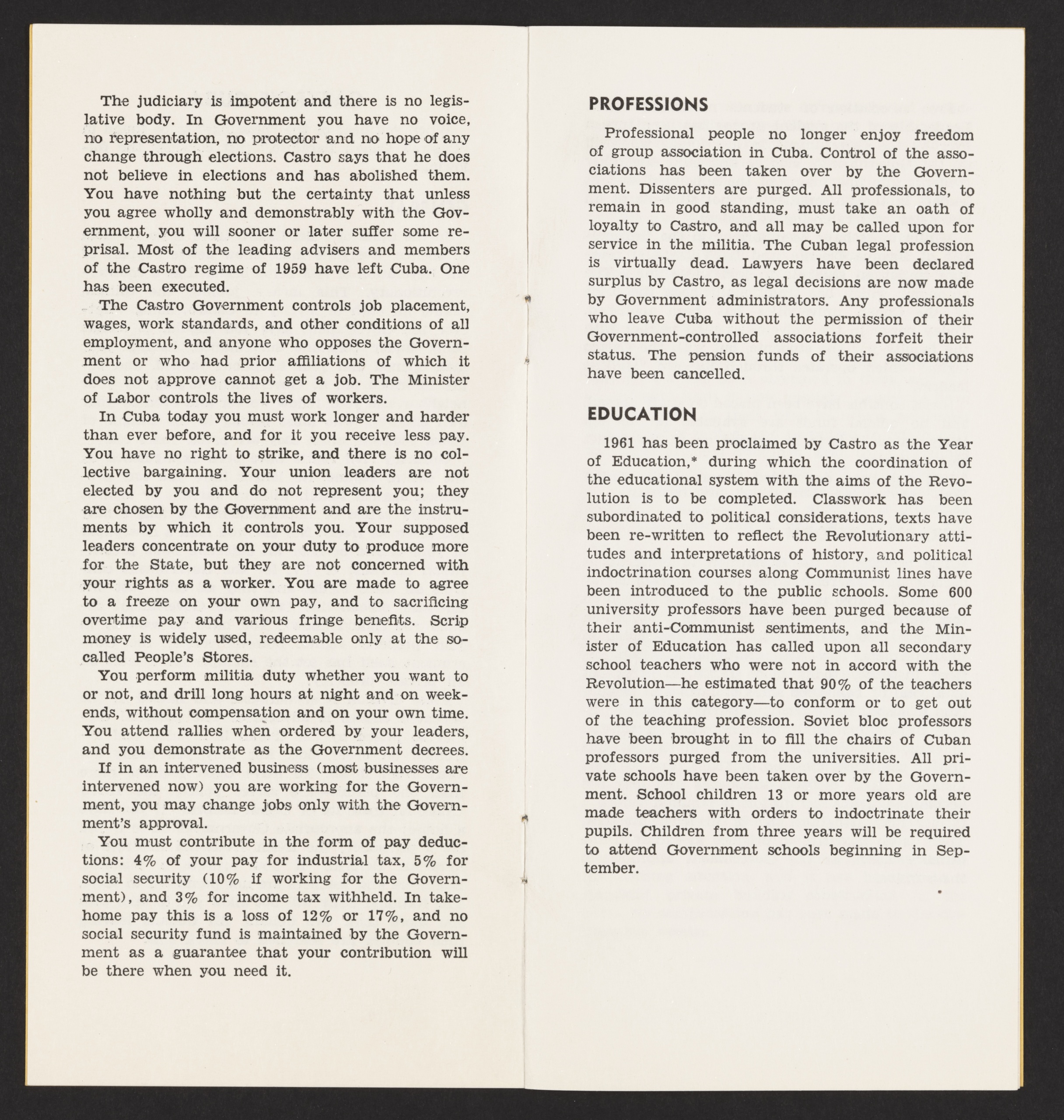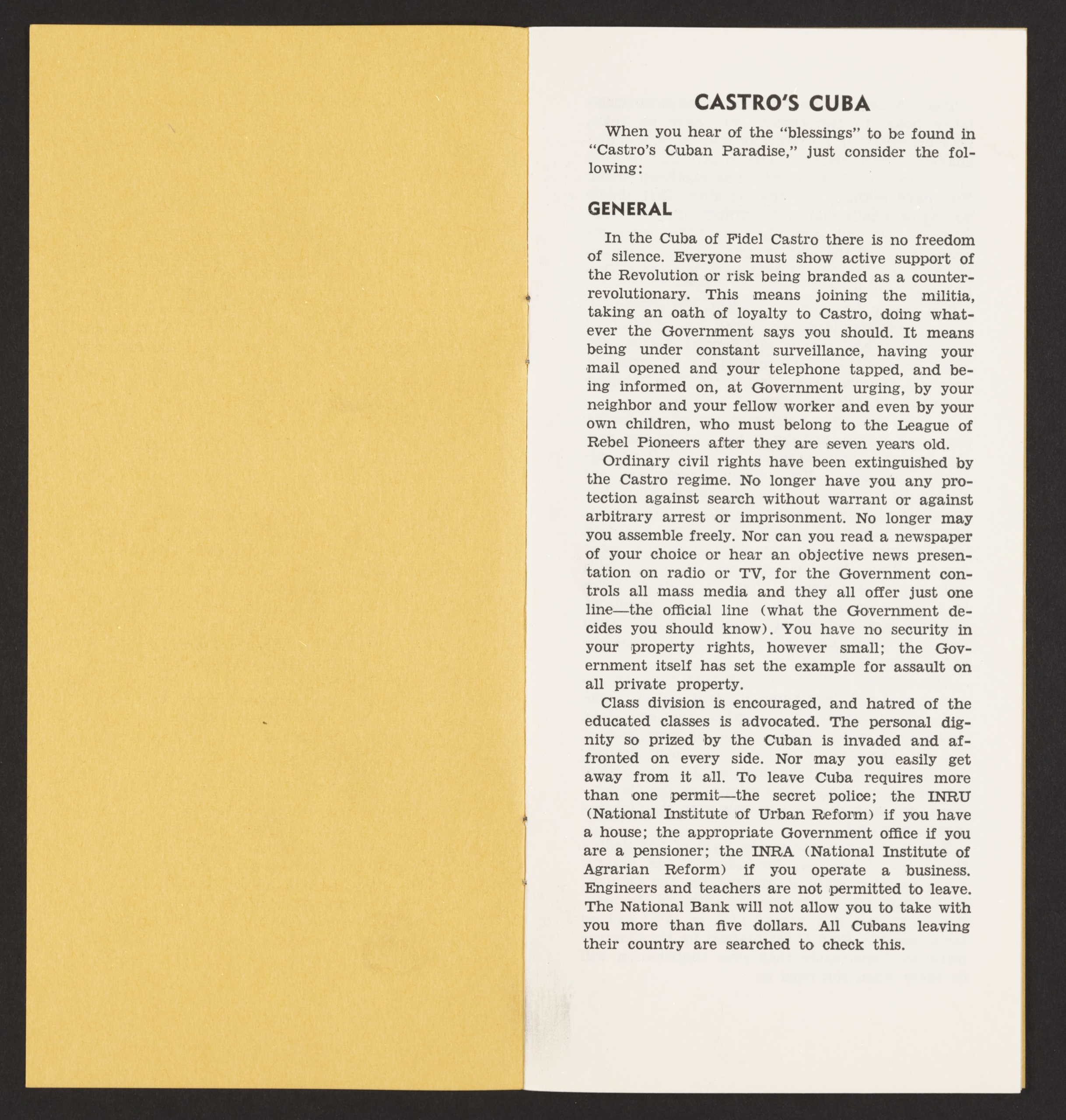 Visually, the piece leans on simplicity: a strong monochrome cover with minimal ornamentation. The plain format—stapled pages of typed text—reinforces a sense of immediacy and seriousness. On the inside, the headings (“Castro’s Cuba,” “General,” “Professions,” “Education,” “Agrarian Reform,” “Urban Reform”) partition the argument, giving the impression of thorough research. The frequent use of the phrase “you no longer” (e.g., “No longer may you assemble freely”) underscores a before-and-after narrative of lost liberties. While there are no dramatic illustrations or photographs, the earnest tone and alarming bullet points serve a rhetorical purpose: to mobilize readers against what the pamphlet characterizes as an emerging communist stronghold just 90 miles off the U.S. coast.