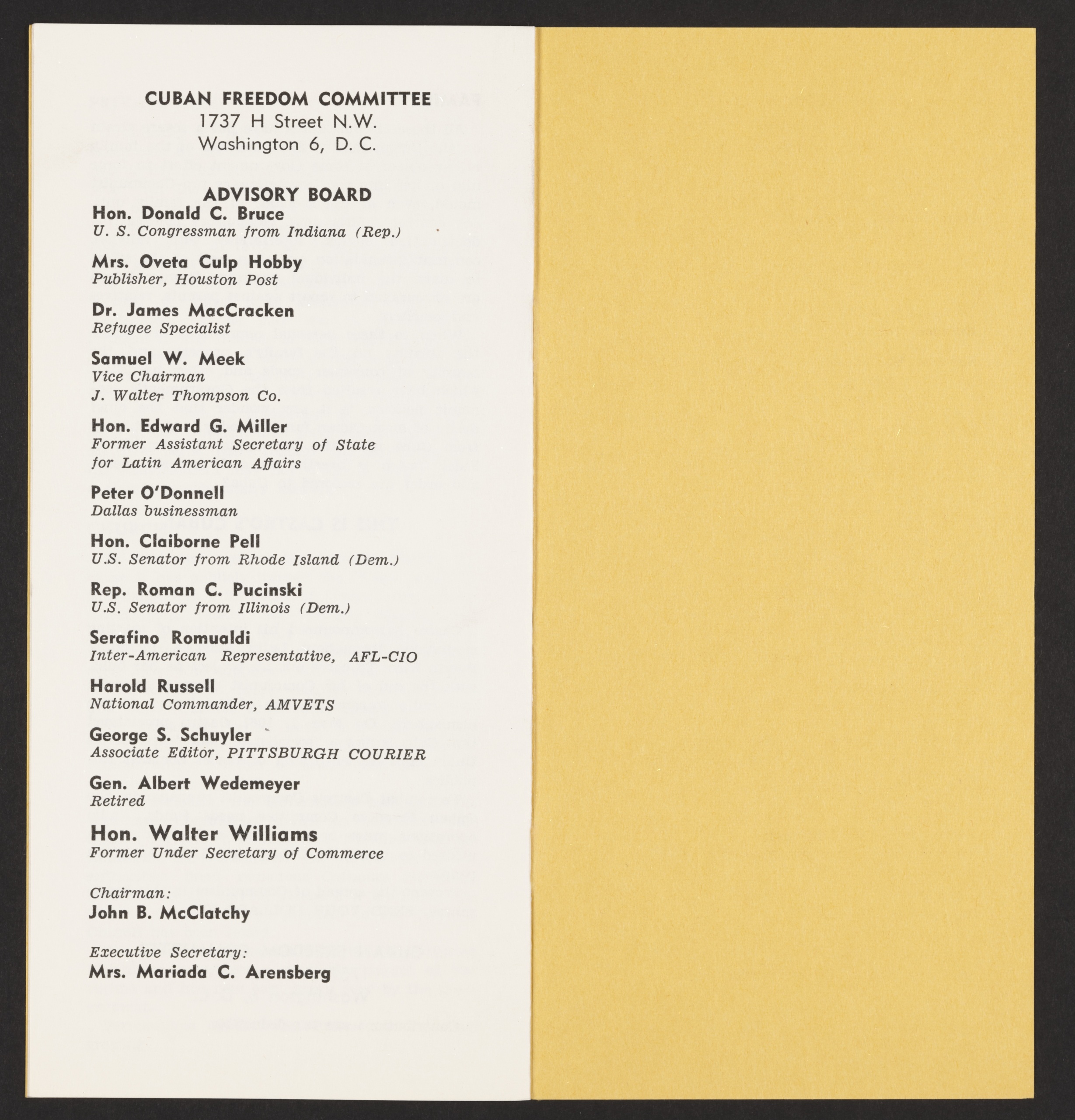 In this vividly colored pamphlet titled “Cuba Today,” the Washington, D.C.–based Cuban Freedom Committee lays out its vehement opposition to Fidel Castro’s government in the early 1960s. Bold black lettering on a bright yellow background announces a mission of “sponsoring radio programs countering Castro’s Communist propaganda,” highlighting the intense ideological battles of the Cold War era. The pamphlet’s front page lists station names—WGBS (Miami), WKWF (Key West), and Radio Swan—underscoring how anti-Castro messaging was beamed across the Florida Straits and beyond.