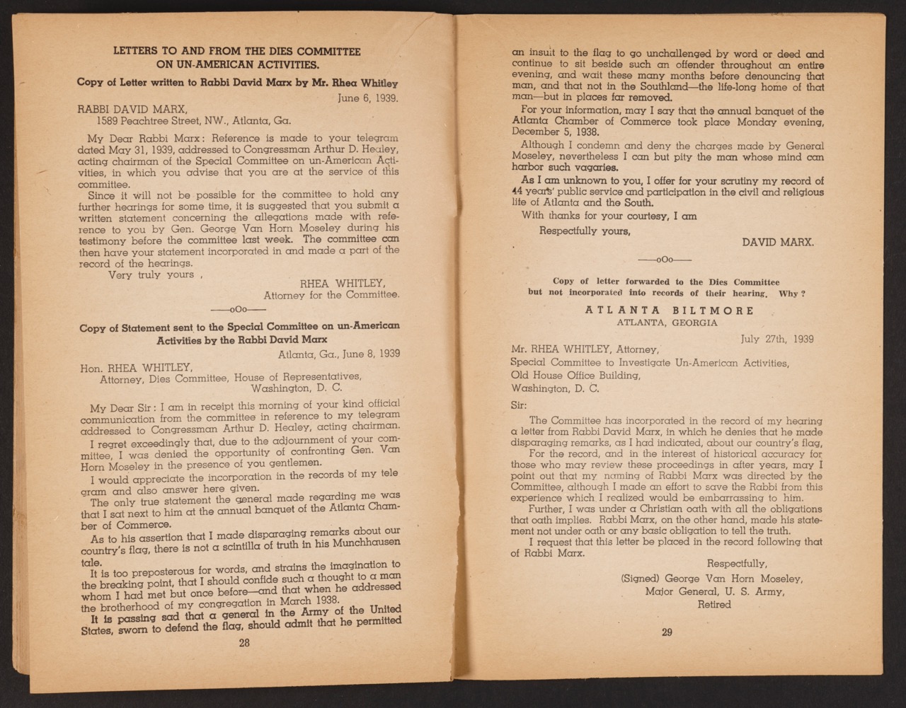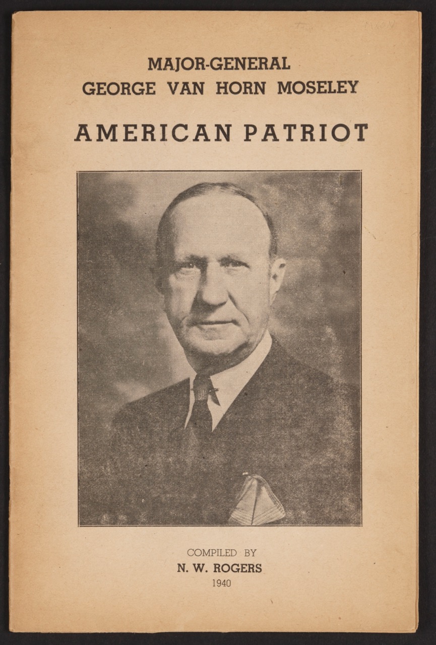 A slim pamphlet compiled by N. W. Rogers in 1940, Major-General George Van Horn Moseley, American Patriot presents an extensive collection of speeches, forewords, and quotes aimed at cementing Moseley’s status as a fervent defender of the United States. The cover features a somber photograph of Moseley in civilian attire—a visual choice that casts him as both a seasoned military leader and a civilian patriot. While the word “patriot” dominates the title, the contents of this publication reveal a far more complex narrative, fueled by anxieties about immigration, anti-Semitic sentiments, and deep skepticism toward the U.S. government’s engagement with the looming crisis overseas.