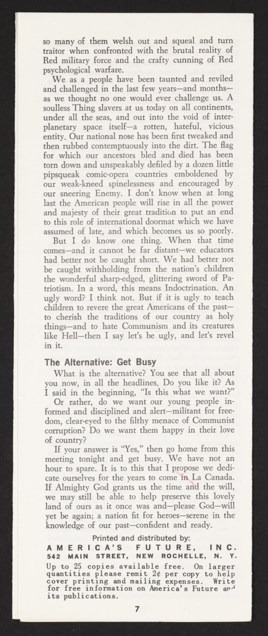 Reprinted by America’s Future, Inc., “The Passing of the Patriot” captures Dr. Max Rafferty’s 1961 speech lamenting a supposed waning of American patriotism. Then the superintendent of schools in La Cañada, California, Rafferty urges educators, parents, and policymakers to combat what he sees as creeping indifference—and even hostility—toward traditional American values. Deeply rooted in Cold War anxieties, the pamphlet insists that “indoctrinating” children in love of country and hatred of communism is necessary to preserve national strength and moral clarity.