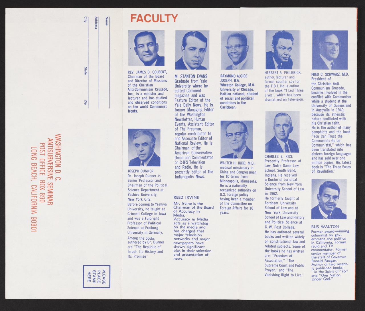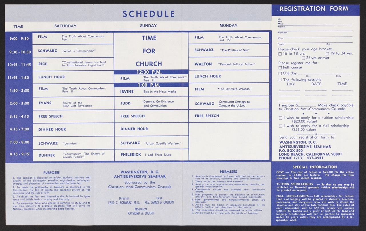 This trifold pamphlet promotes a three-day “Anti-Subversive Seminar,” hosted in Washington, D.C., in July 1975 by the Christian Anti-Communism Crusade. Led by Dr. Fred C. Schwarz—an Australian-born physician and fervent anti-communist—this event exemplified the ongoing mid-1970s push among conservative religious groups to warn Americans against what they saw as socialist and communist infiltration, even as the Vietnam War was winding down and Cold War tensions were in flux.