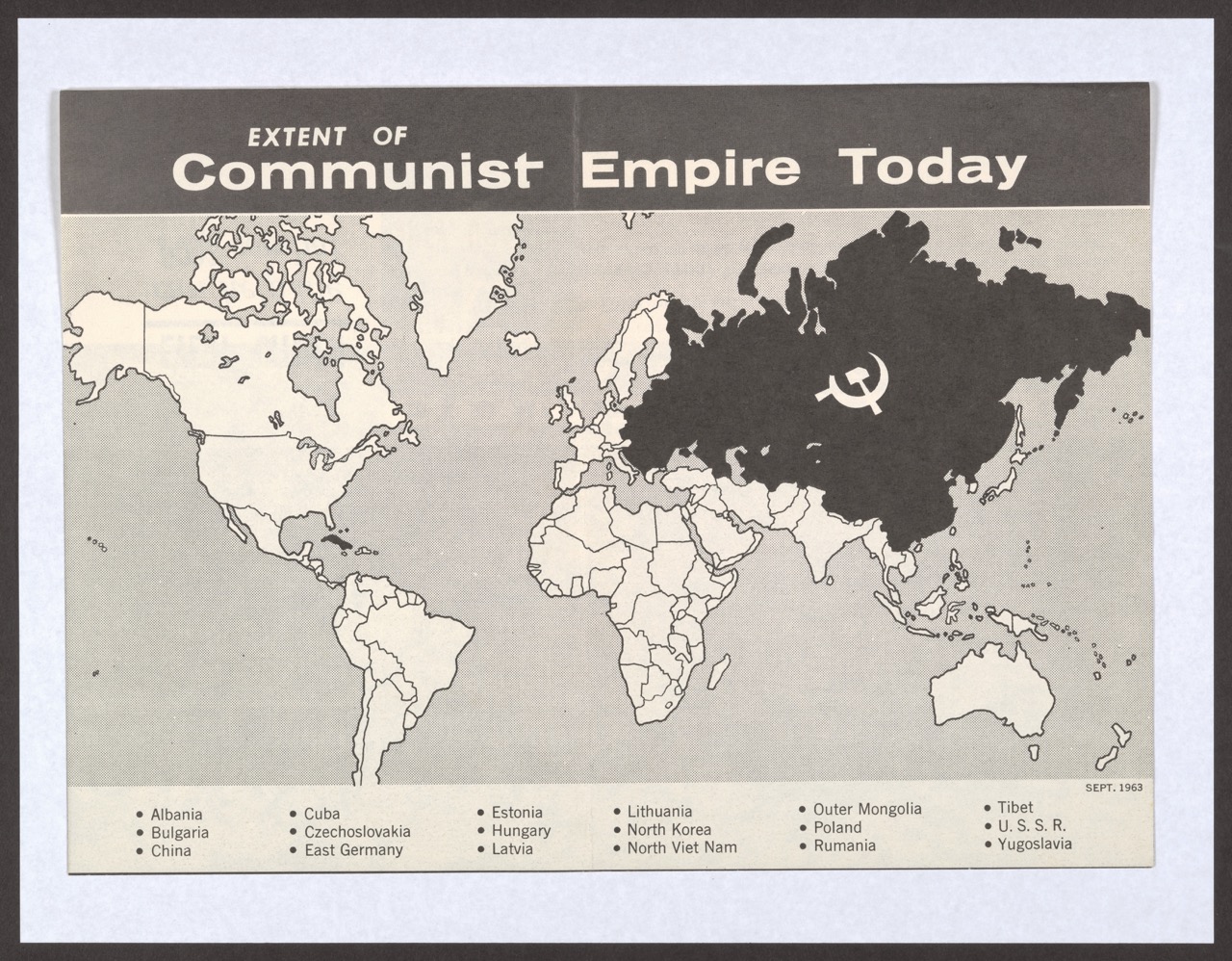 - Map of the ‘Communist Empire’: A silhouetted Soviet bloc appears ominous and large, suggesting a vast, encroaching menace encircling the free world.
