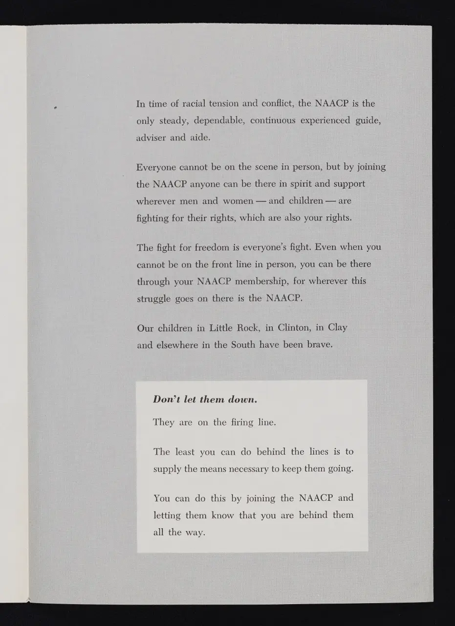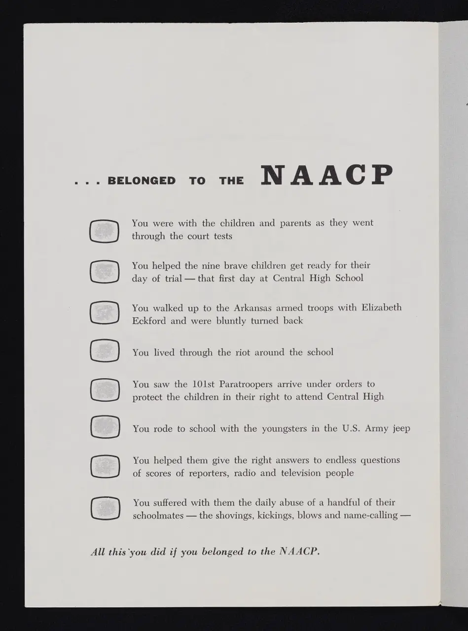 The pamphlet’s checklist-style format (“You…helped the nine brave children get ready…walked up to the Arkansas armed troops with Elizabeth Eckford…lived through the riot…”) vividly links membership in the NAACP to personal participation in these historic events. Rather than describing them at a distance, the text powerfully draws the reader in, underscoring that solidarity can transcend geography. - Membership = Action