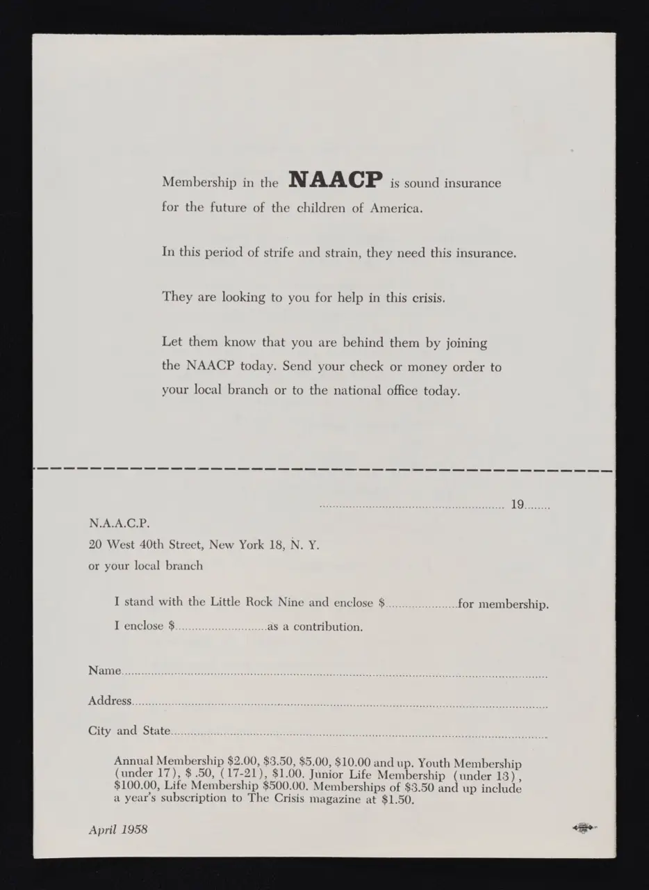 The pamphlet’s direct, empathetic tone likely resonated with individuals unsettled by the violent scenes from Little Rock. Encouraging membership in the NAACP gave ordinary citizens a clear path to contribute. Its call to “send your check or money order to your local branch” turned moral support into concrete organizational capacity.