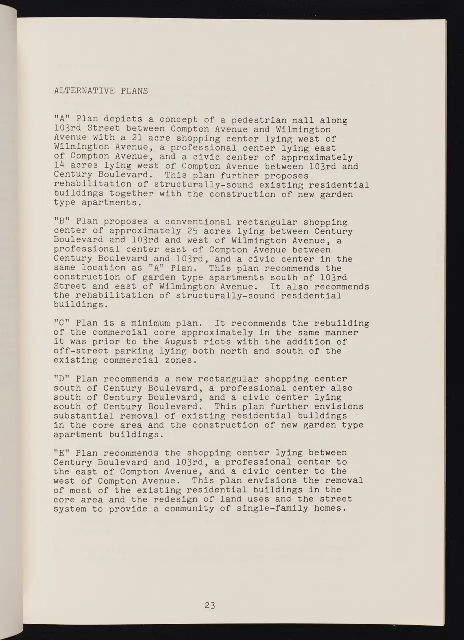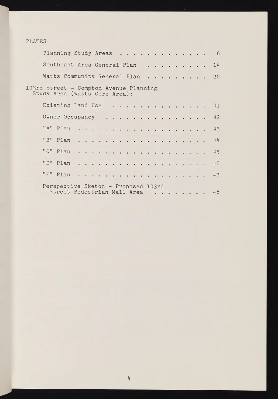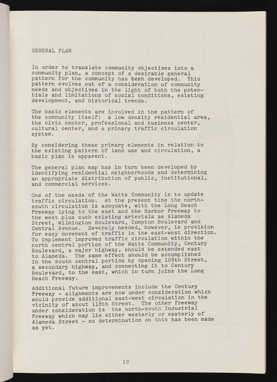 In April 1966—less than a year after the Watts Rebellion—Los Angeles City officials released a comprehensive planning document aimed at transforming and revitalizing the heavily impacted Watts neighborhood. This “Watts Community Plan” was part of a broader Southeast Los Angeles urban strategy, conceived to address the deep-seated issues of poverty, unemployment, and racial inequality that had come to the surface in the summer of 1965.