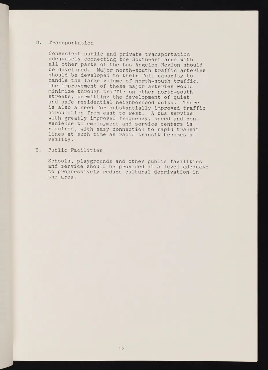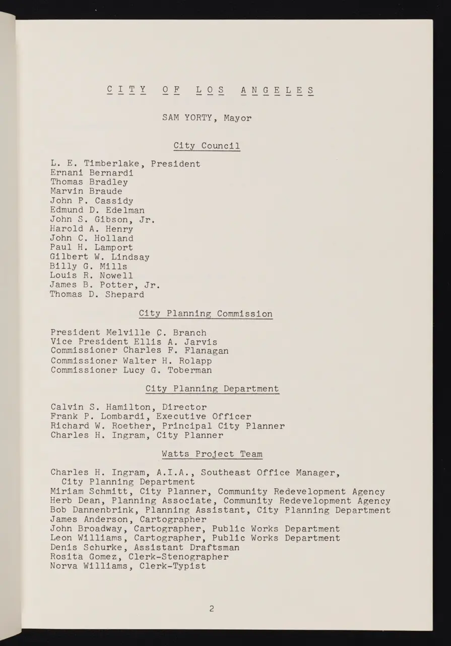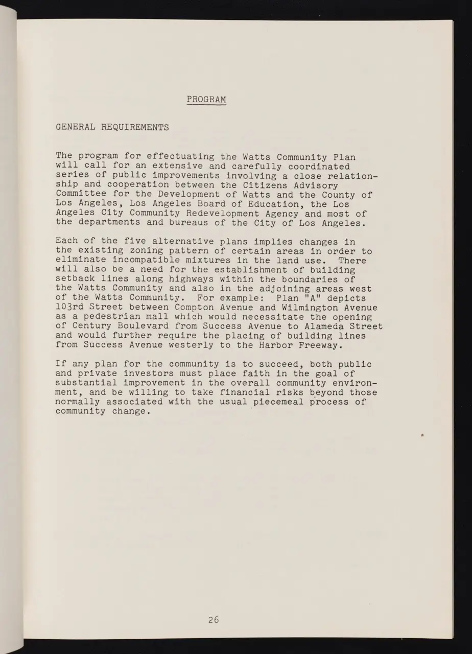 In April 1966—less than a year after the Watts Rebellion—Los Angeles City officials released a comprehensive planning document aimed at transforming and revitalizing the heavily impacted Watts neighborhood. This “Watts Community Plan” was part of a broader Southeast Los Angeles urban strategy, conceived to address the deep-seated issues of poverty, unemployment, and racial inequality that had come to the surface in the summer of 1965.