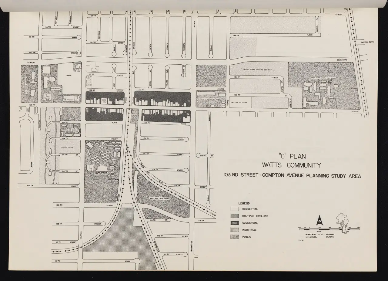 The Watts Rebellion in August 1965 was a critical flashpoint in the ongoing struggle over racial injustice and economic disparities, leading many Angelenos to question how and why such unrest erupted in what appeared, from the outside, to be a thriving metropolis. In the immediate aftermath, local officials, civic leaders, and community members demanded new policies and development strategies to prevent further upheaval. Published by the Los Angeles City Planning Department, the Watts Community Plan reflects this urgency. It pulled from recent research on “hard-core unemployment and poverty” to guide proposed land use, housing upgrades, and community resources. While the plan sought to address the root causes of unrest, its recommendations reveal both the ambitions and the limitations of 1960s-era urban planning.