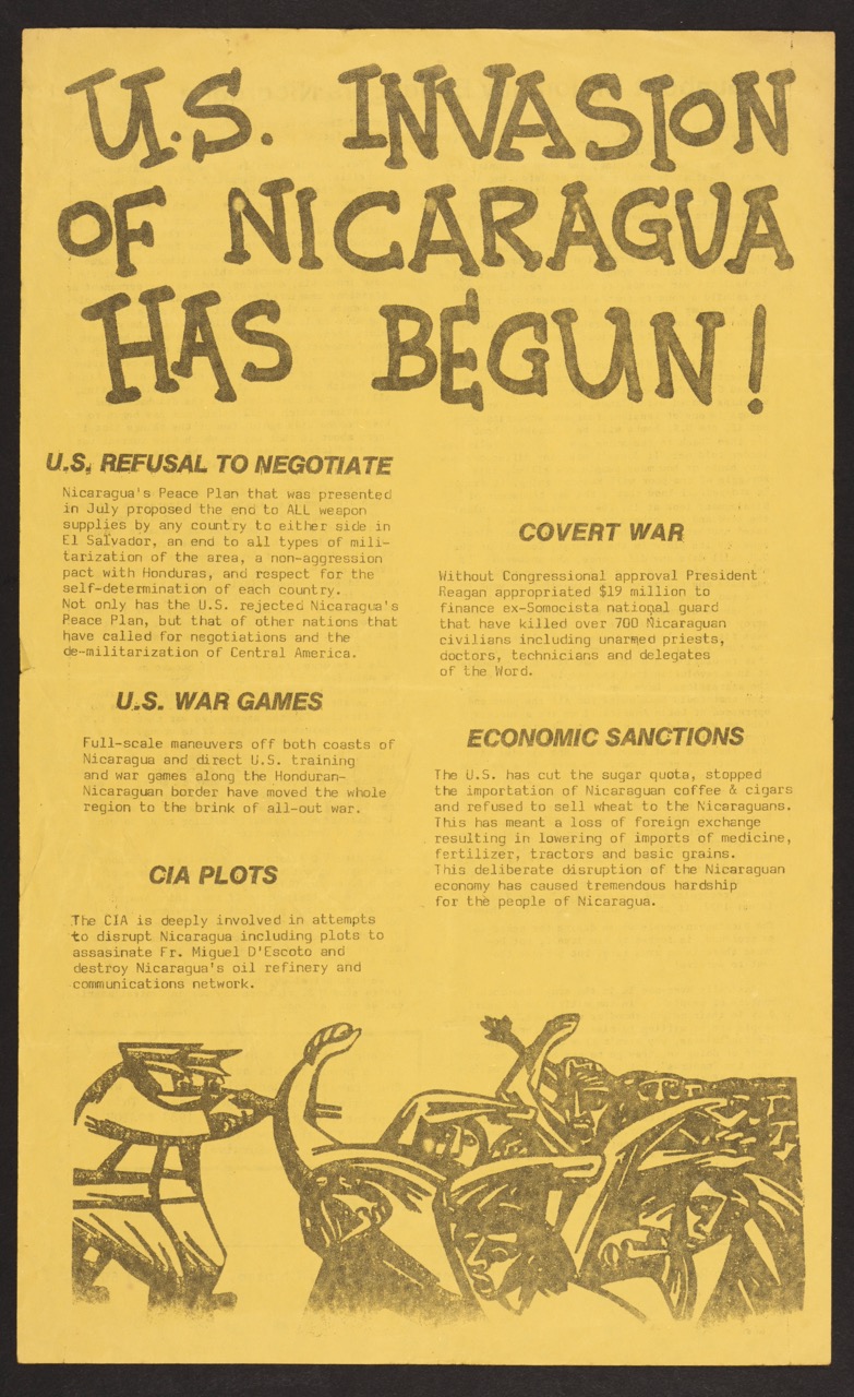 With the banner-like text proclaiming “U.S. INVASION OF NICARAGUA HAS BEGUN!”, the flyer compels immediate attention. By framing the conflict as an imminent or ongoing invasion, the authors stoke a sense of urgency—an effective tactic for energizing public action. - Detailed Accusations