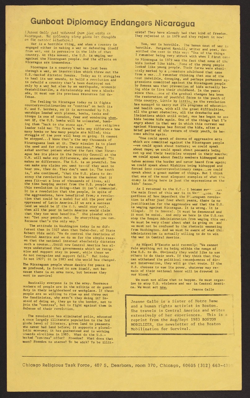 The second page features a personal narrative by Jeanne Gallo, a Sister of Notre Dame and human rights activist. She recounts her observations from a trip to Nicaragua, emphasizing human costs: families torn apart, fear among civilians, and the tangible devastation of U.S. policies. This grassroots, eyewitness perspective fosters empathy while reinforcing the pamphlet’s larger indictment of American aggression. - Religious and Moral Framework