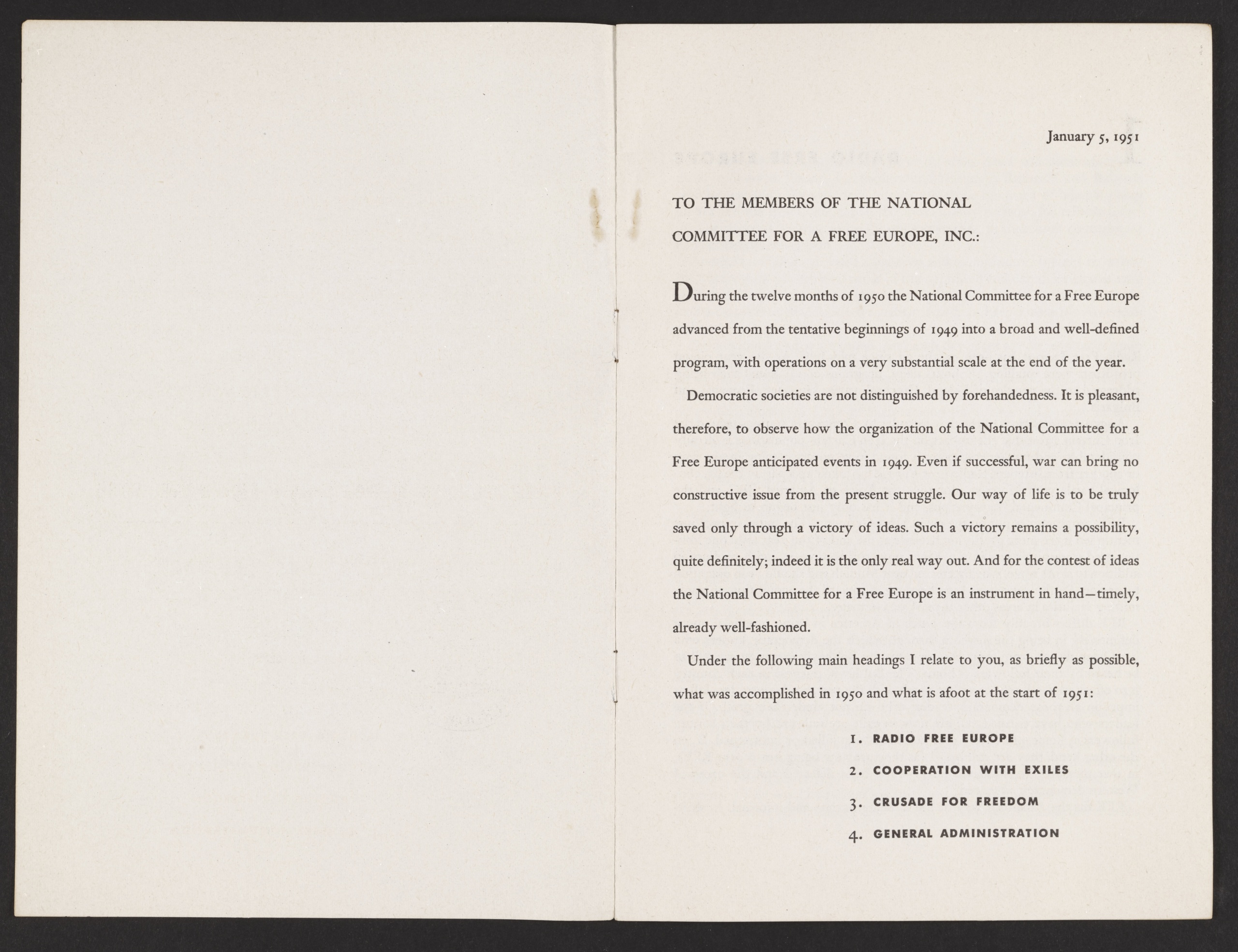 During the early years of the Cold War, the National Committee for a Free Europe (NCFE) emerged as one of the most influential organizations shaping American outreach to Eastern Europe. Its “President’s Report for the Year 1950,” published in January 1951, provides a snapshot of the group’s ambitions, methods, and messages at a time when ideological tensions between the West and Soviet-aligned states were on the rise.