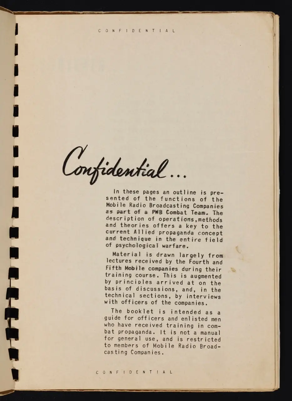 During World War II, psychological operations were used by the Allies and Axis alike to demoralize opposing troops and sway civilian populations. This manual—produced for “Mobile Radio Broadcasting Companies”—outlines tactics such as radio propaganda, leaflet drops, and loudspeaker messages. The overarching objective was to weaken enemy resolve, encourage surrenders, and disrupt command structures.