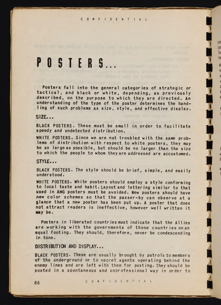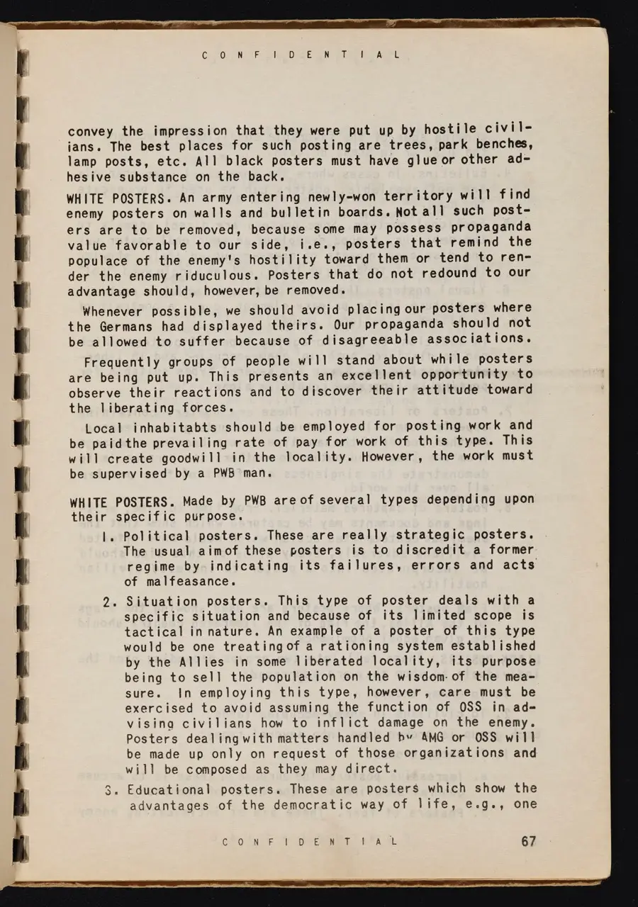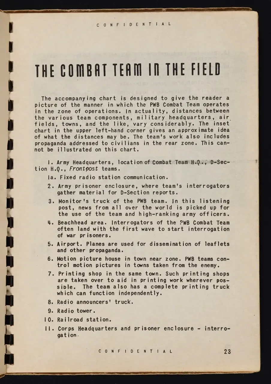 This spiral-bound, “CONFIDENTIAL” manual details the operations, methods, and theories of the Psychological Warfare Branch (PWB) Combat Team during World War II. Though designed for battlefield use, its pages offer potential lessons for activists, showing how information campaigns can powerfully influence public sentiment.