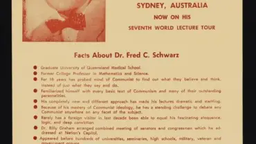 See full scan at the bottom of the page. In this mid-20th-century flyer, Dr. Fred C. Schwarz—an Australian surgeon and psychiatrist—announced his “Seventh…